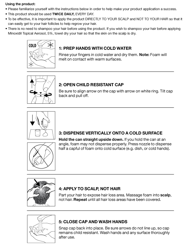 Minoxidil al 5%, butano, hidroxitolueno butilado, alcohol cetílico, ácido cítrico, alcohol deshidratado, isobutano, ácido láctico, polisorbato 60, propano, agua purificada, alcohol estearílico.